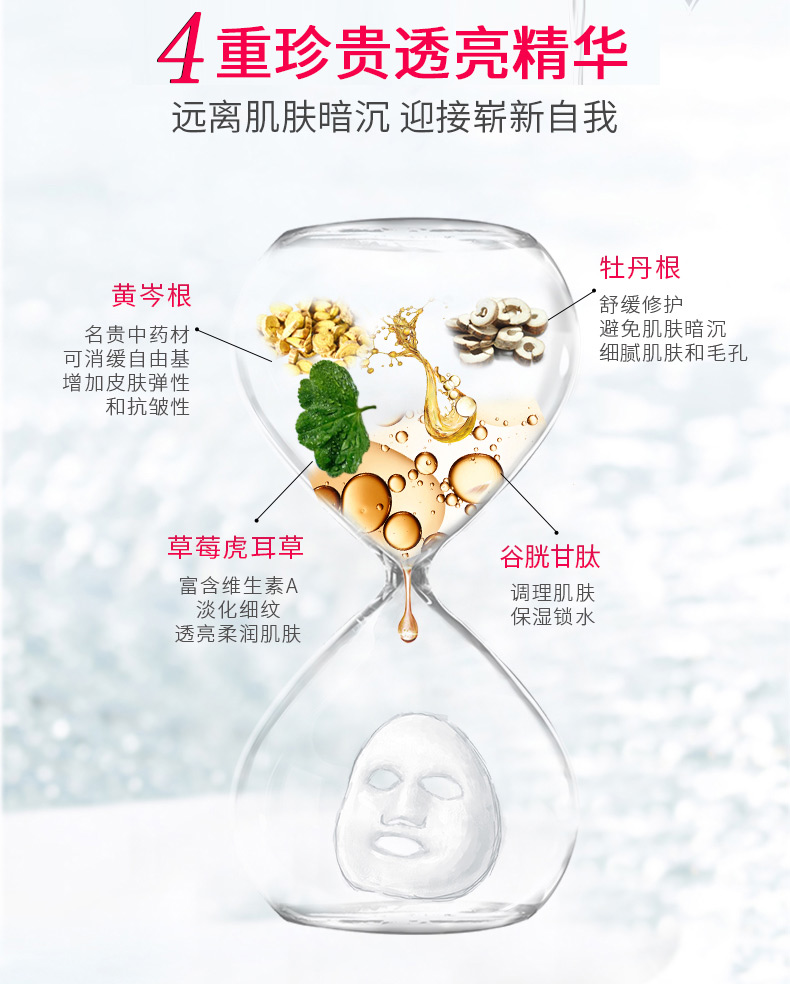 透亮:復合多種高效亮妍成分,改善肌膚暗沉,使肌膚透亮有光澤。